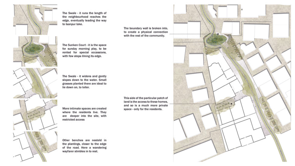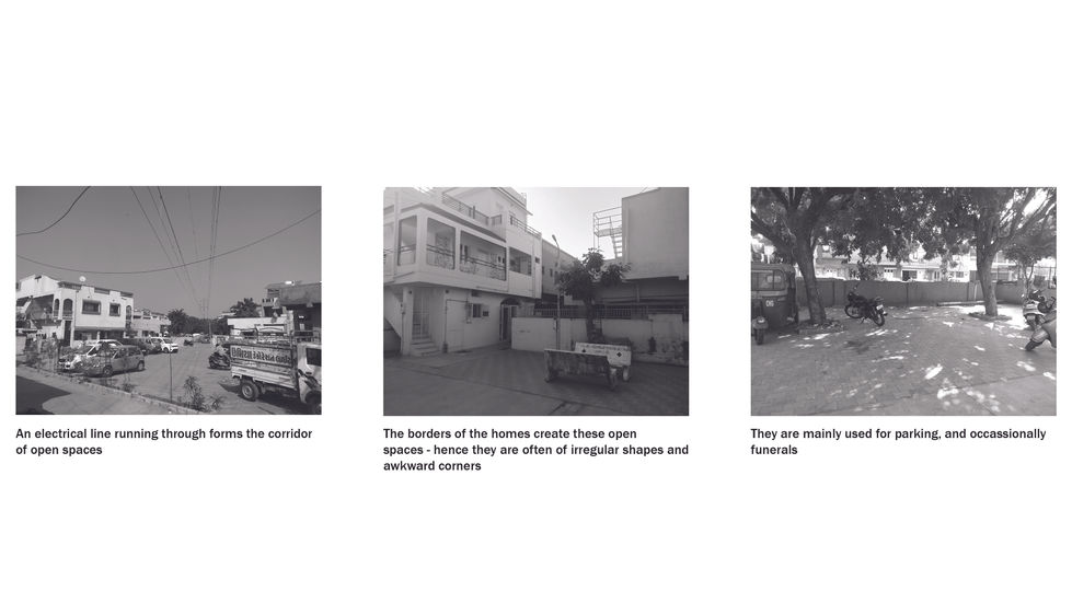The project is based in a typical neighbourhood in one of the first suburbs of the city. The idea stems from a pre-existing condition on site, where a long string of open spaces are aligned but disconnected due to boundary walls. They are deep set within co-operative societies and act as common plots, for parking and otherwise. The deeper you walk into the neighbourhood, the more of these you see. A string of open spaces, where you can see them in a line, but can’t walk across. It forces us to imagine what it must be like looking across the boundary, onto another open space, empty, except for a few dust covered cars standing under sparse neem trees? And then to imagine long rolling greens in these spaces. To indulge in the urge to cross the boundary. To walk across the neighbourhood without ever having to come out. The manifesto begins by imagining routes that rise above these boundary walls, as elevated structures. However, it transformed into ways of occupying these empty spaces themselves and adapting them to the community's needs.